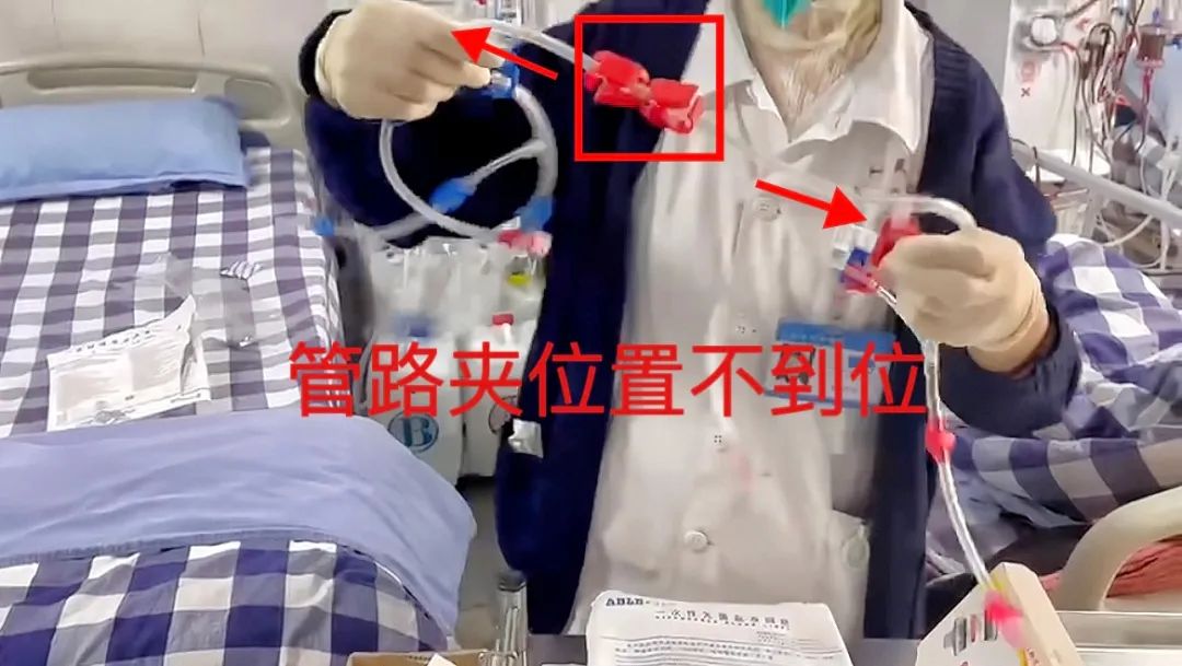 隨后,我觀察護士們進行血液灌流的臨床操作,在操作密閉式連接管時,發現了一個使用不當的情況:密閉式連接管的管路夾位置不正確,透析支路的管路夾未推到兩頭(如圖,管路夾在透析支路正中)。